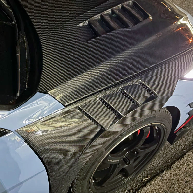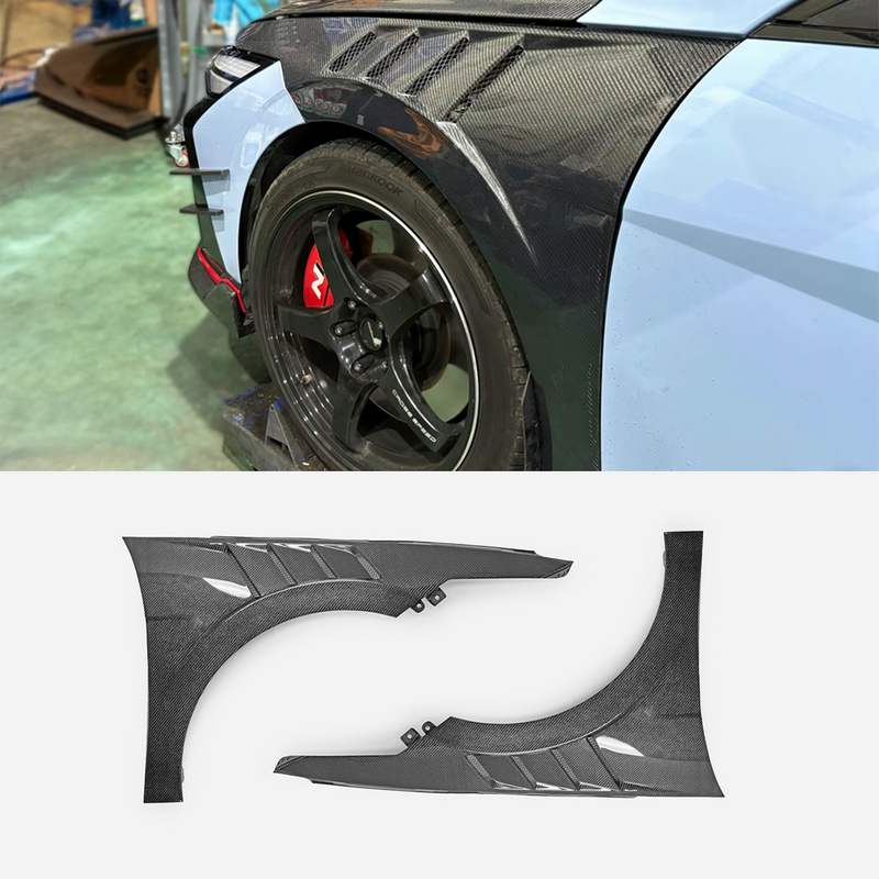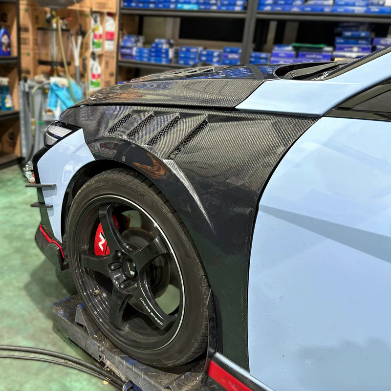 Give your 23+ i30 N sedan or Elantra N a bold upgrade with these aggressive N Spec vented carbon fiber fenders. Designed for the 2023+ sedan models, these fenders blend lightweight performance with functional styling - improving ventilation while enhancing the car’s visual presence. Crafted from high-quality carbon fiber, they reduce front-end weight and add a motorsport-inspired edge that turns heads on the street or at the track.